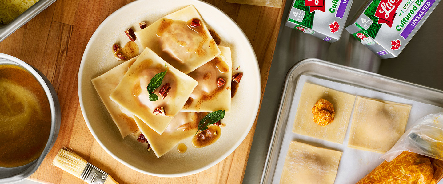 - Arroser les raviolis de sauce au beurre noir. Garnir de feuilles de sauge croustillantes, de pacanes grillées et de fromage parmesan supplémentaire ou de copeaux de fromage parmesan.