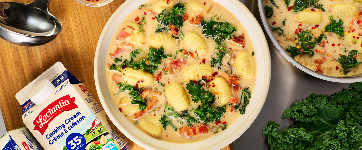 - Add gnocchi, kale, heavy cream, milk, and lemon juice. Continue simmering for 5 minutes or until gnocchi floats to the surface.